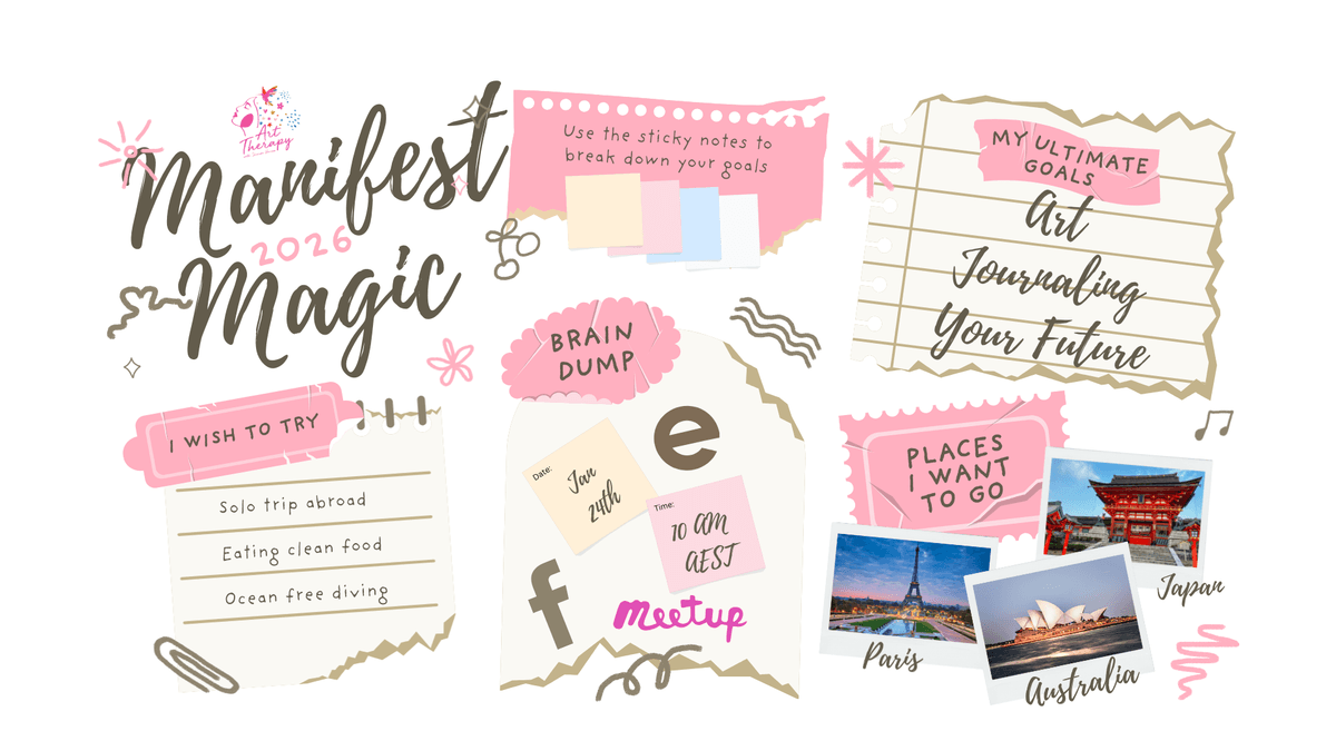 Step into the new year with intention, creativity, and a little bit of magic. Manifest Magic 2026 is a transformative art journaling + vision boarding workshop designed to help you clarify what you want, align with your deepest desires, and visually map out the year you want to create.